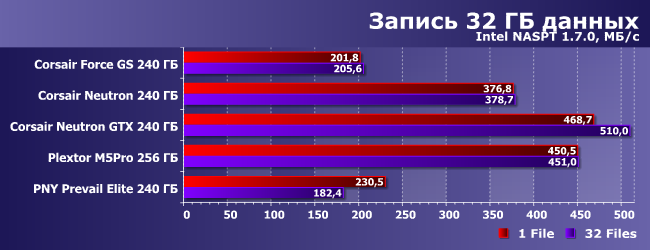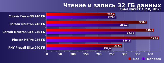 Что касается остальных испытуемых, то два Neutron идентичны — как и можно было предположить. А оба SSD на SandForce медленнее их, причем Force GS существенно быстрее «энтерпрайзного» PNY.