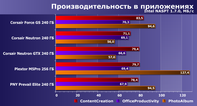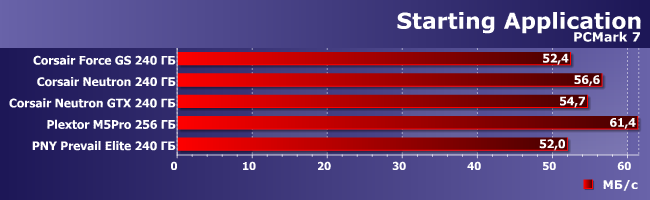Как уже было сказано в описании тестовой методики и не только в нем, результаты подтестов PCMark7 мы приводим только в одном случае — если разброс значений превышает 10%. Так что в сегодняшней статье будет всего одна, зато самая интересная — запуск приложений. И вот на ней уже лидерство новой модели Plextor видно отлично. Кстати, раз уж мы начали выше пытаться сравнивать результаты с винчестерами, то тот же WD VelociRaptor (самый быстрый из настольных не гибридных моделей) тут ровно на порядок медленнее. В общем, практически нечего сравнивать. А вот разброс показателей у разных SSD куда более скромный. И, что интересно, Neutron GTX опять оказался медленнее «обычного».