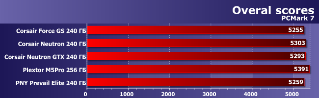 Все животные равны, но некоторые — равнее других: призванный эмулировать реальную пользовательскую нагрузку PCMark поставил на первое место Plextor M5Pro с превышением над прочими участниками аж на 2%. И Neutron быстрее, чем Neutron GTX — уже на 0,2%, но и это весело. Ну а в общем и целом — просто все очень быстрые. Чтоб было понятно: на нашем тестовом стенде терабайтный WD VelociRaptor в этом тесте получает результат 2737 баллов, а трехтерабайтный WD GP и вовсе 1929 баллов. С учетом того, что самые медленные из протестированных нами SSD далеко за 4000 перескакивают легко, а сегодняшние герои и за 5000 уходят, становится очевидным, что с качественной точки зрения это просто непересекающиеся миры. По крайней мере, с точки зрения PCMark.