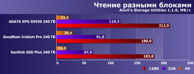 Примечательно, что на блоках большего размера (что, опять же, для типичного настольного компьютера очень актуально) недорогие твердотельные накопители могут оказаться и равными «среднему классу», что и приводит к очень близким результатам в тестах высокого уровня. Однако в основном это относится к SX930, а не к SSD Plus, который в любом виде оказывается аутсайдером.