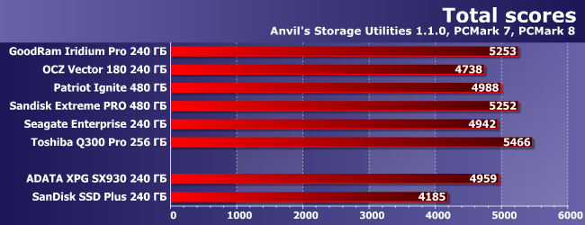 PCMark 8 оперирует комплексными нагрузками, учитывая быстродействие не только собственно накопителей, но и других компонентов компьютера, так что в общем и целом его оценки для SATA SSD различаются незначительно. Хорошая, в сущности, новость для тех, кто присматривается к недорогим устройствам.