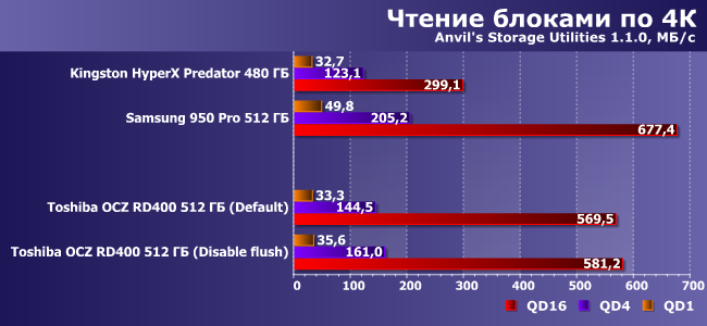 | Kingston HyperX Predator 480 ГБ | Samsung 950 Pro 512 ГБ | Toshiba OCZ RD400 512 ГБ (Default) | Toshiba OCZ RD400 512 ГБ (Disable flush) | |