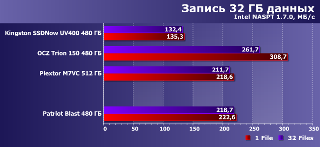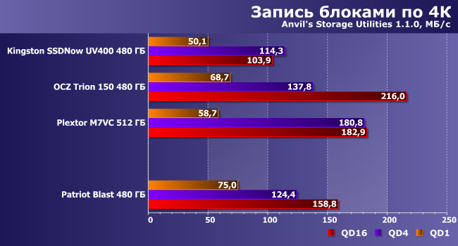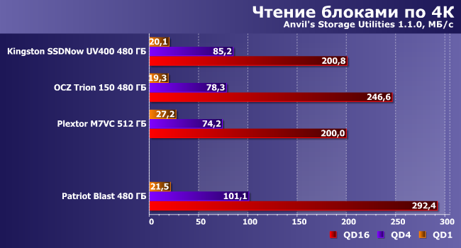 | Patriot Blast 480 ГБ | Kingston SSDNow UV400 480 ГБ | OCZ Trion 150 480 ГБ | Plextor M7VC 512 ГБ |