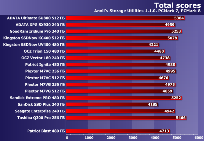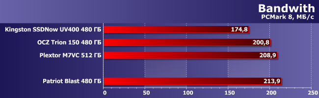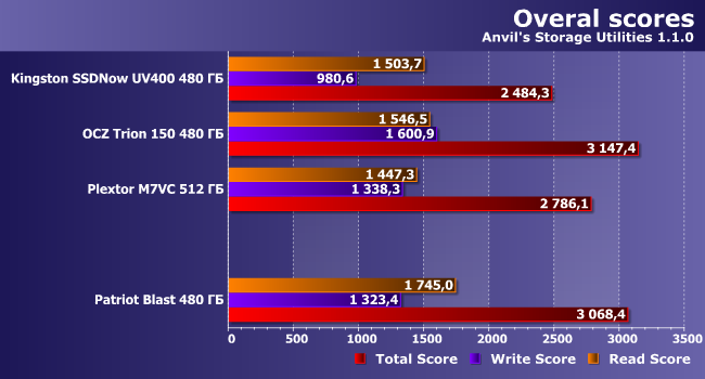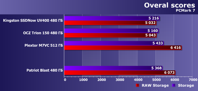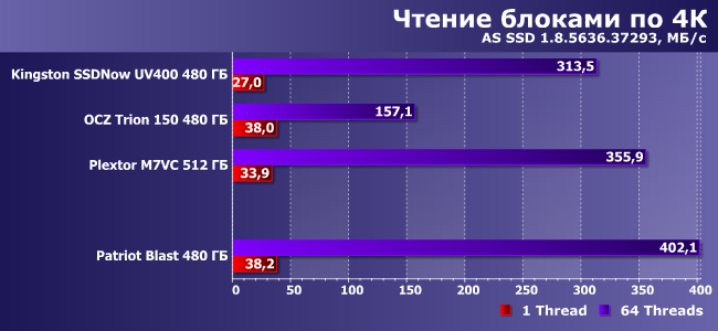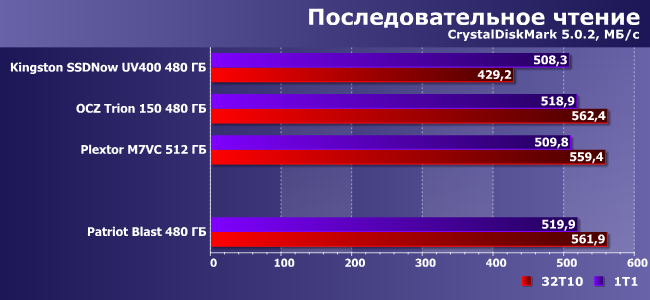| Patriot Blast 480 ГБ | Kingston SSDNow UV400 480 ГБ | OCZ Trion 150 480 ГБ | Plextor M7VC 512 ГБ | |