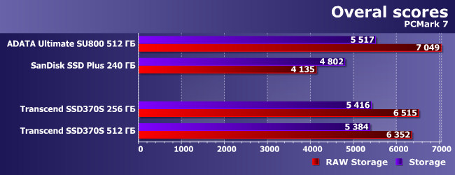 Как и следовало ожидать (да и давно стало привычным), «в попугаях» PCMark 8 все накопители имеют одинаковую «длину» — разве что SSD Plus немного медленнее других участников.