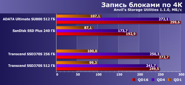 Переход на более низкий уровень резко «проваливает» его же, а остальная тройка остается примерно равноценной. Что интересно, SSD370S на 512 ГБ работает немного медленнее, чем 256 ГБ — и это мы еще не раз увидим далее.