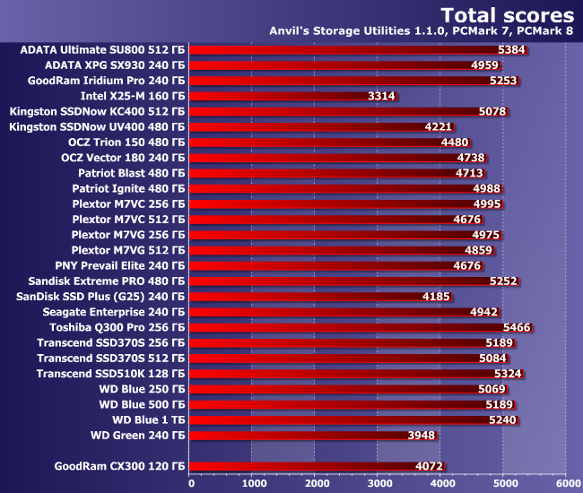 Как и следовало ожидать, по «усредненной производительности» СХ300 и его аналоги попадают в самый нижний скоростной класс. Однако это самый нижний скоростной класс современных устройств, а «исторические» бывали и более медленными, причем независимо от цены. Ну, и в любом случае сравнение имеет смысл лишь в пределах одного типа устройств, поскольку механические накопители «в целом» еще хуже (пусть даже с некоторыми сценариями они могут справляться лучше, чем бюджетные SSD).