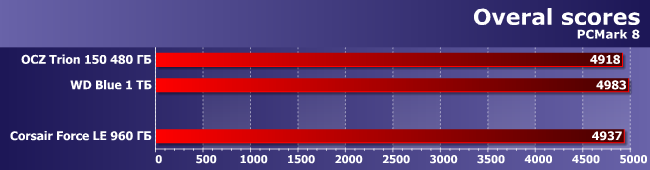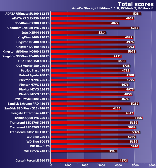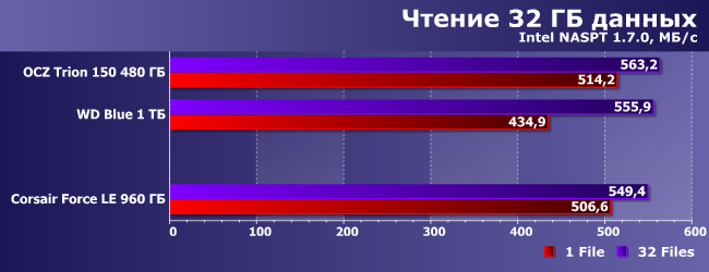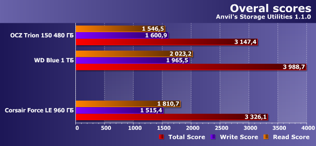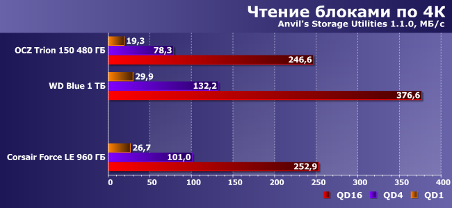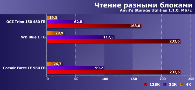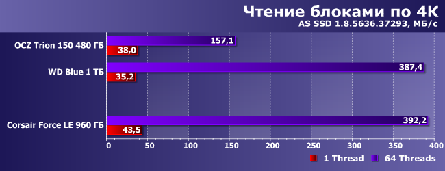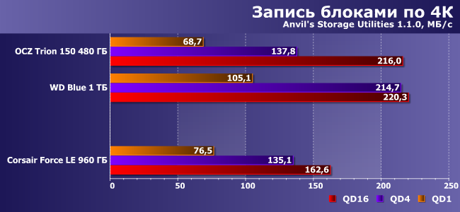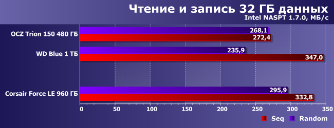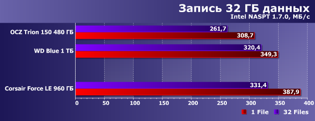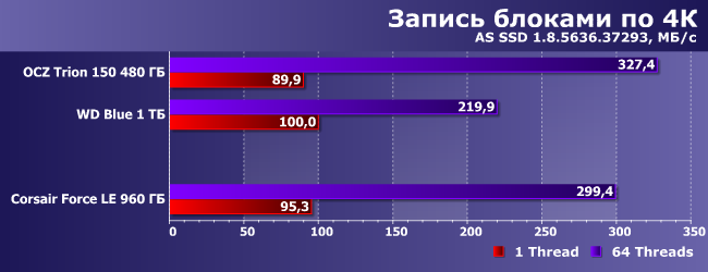 Но при увеличении объема и смене алгоритмов эффект пропадает. Впрочем, Force LE все равно в большинстве случаев немного быстрее, чем Trion 150, а причины некоторого отставания от WD Blue указаны выше.