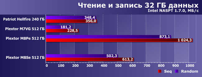 В основном мы видим закрепление пройденного, причем влияние SLC-кэширования выражено слабо, поскольку емкости кэша, как уже было сказано выше, заведомо недостаточно для того, чтобы «ворочать» 32 ГБ данных. Так что внимания здесь заслуживает лишь то, что с одновременными операциями записи и чтения M8Se, несмотря на «бюджетную» память, справляется лучше, чем Patriot Hellfire 240 ГБ, AData XPG SX8000 256 ГБ и любые твердотельные накопители с SATA-интерфейсом, независимо от типа и объема памяти. Что ж, как видим, новые технологии и в бюджетном сегменте иногда работают даже там, где от них ничего особенного не ожидалось.