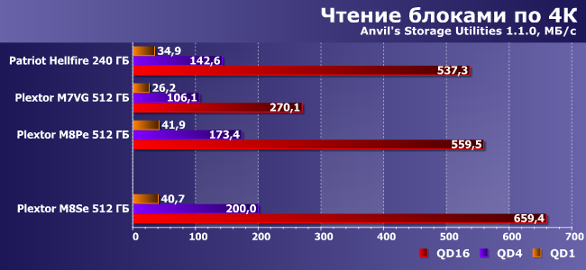 Но в прикладном ПО на данный момент все же чаще встречается чтение, причем и блоками больше 4К, но с единичной очередью команд (более длинная в массовом персональном компьютере просто «не успевает собраться»). И в таких сценариях производительность M8Se не рекордная, но, в общем-то, чуть более высокая, чем у SATA-накопителей с тем же типом памяти. Так что и в этом сегменте какой-никакой выигрыш от перехода на новые интерфейсы есть.