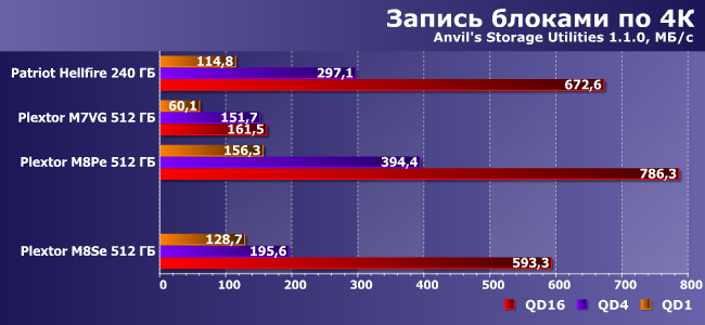 Результаты M7V можно не принимать во внимание: при таких нагрузках интерфейс имеет решающее значение, а пропускная способность SATA600 давно уже «выбрана» полностью. В остальном никаких неожиданностей: при чтении M8Se примерно эквивалентен M8Pe — как и должно быть.