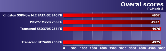 Впрочем, на чуть более низком уровне использующий TLC-память Plextor M7V немного отстает от прочих испытуемых. Но и Kingston SSDNow M.2 SATA G2 тоже чуть-чуть проигрывает паре накопителей Transcend, хотя формально они используют самую старую (из этой четверки) платформу. А внутри этой пары различий нет вообще.