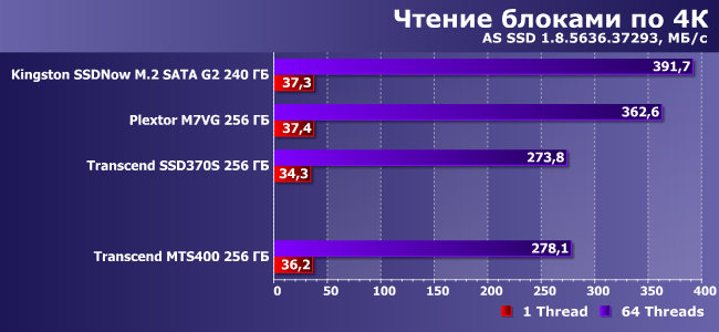 Словом, все «как у взрослых». А есть ли отличия в работе? Вот это мы и решили проверить — благо SSD370S той же емкости был протестирован ранее. Также для оживления пейзажа мы воспользовались и результатами Kingston SSDNow M.2 SATA G2 240 ГБ и Plextor M7VG 256 ГБ, благо это тот же класс и та же емкость. Но аппаратная база немножко разная.