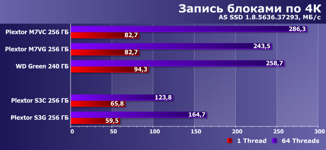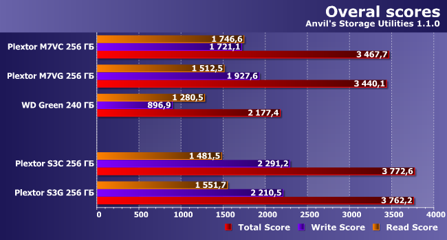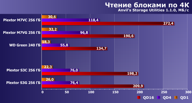 Хотя, как уже было сказано, S3 заменой M7 не является, ориентируясь на более низкий сегмент, в первую очередь мы решили сравнить новинку с M7VC/M7VG той же емкости: не так давно это семейство было самым дешевым предложением компании, а серия S2 вообще промелькнула достаточно быстро и мимо нас :) Также мы взяли WD Green SSD 240 ГБ: как уже было сказано выше, это решение еще «одним этажом ниже», так что сравнение с ним тоже полезно.Тестирование