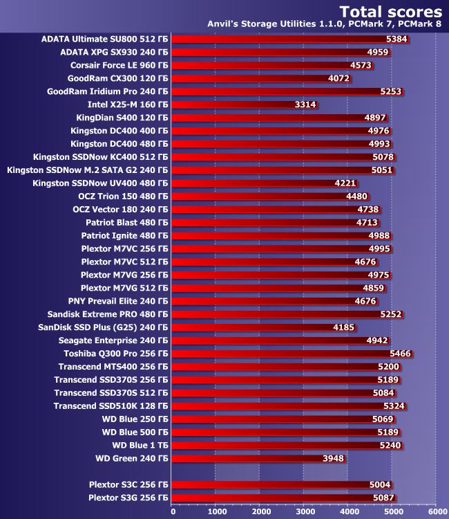 Хотя наличие «низкоуровневого балла» позволяет как-то ранжировать сегодняшних участников. Впрочем, несложно заметить, что он перекликается с «основным» — просто ситуация более четко выражена. Поэтому можно сделать вывод, что сохранение DRAM-буфера — мероприятие полезное. А переход на более простой и дешевый контроллер сам по себе вовсе не обязательно приводит к снижению производительности (в отличие от «обрезания» кэш-памяти).