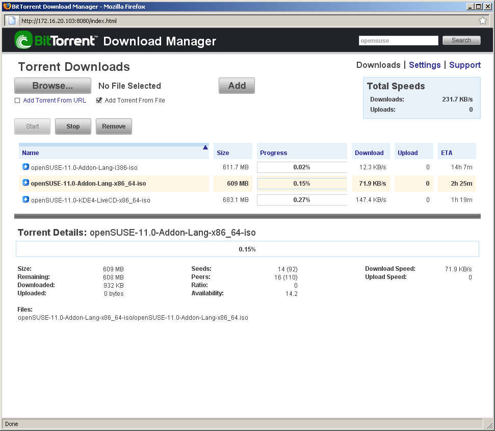 Для рабочих загрузок можно посмотреть состояние — сколько загружено и отдано, с какой скоростью идет работа, сколько осталось времени до окончания, количество сидов и пиров, рейтинг и доступность. Из отображаемого списка файлов торрента можно скачать с накопителя по прямым ссылкам (через браузер) те, что полностью были загружены.