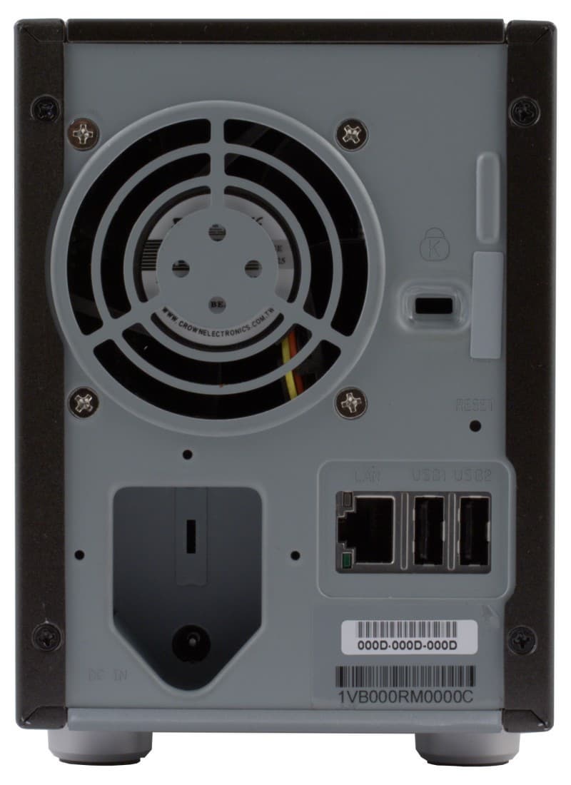 Корпус накопителя компактный — всего 222×142×101 мм. Все, кроме пластиковой лицевой панели, изготовлено из металла. Основной цвет — темно-коричневый с небольшой примесью металлика. И дизайн, и качество изготовления на высоте. Такое устройство будет хорошо смотреться в любой обстановке. Однако надежность лакокрасочного покрытия не очень высокая, если хочется сохранить хороший внешний вид, обращаться с накопителем нужно осторожно. Резиновые ножки добавляют удобства при установке. Большую часть лицевой панели занимает решетка забора воздуха для вентиляции. Также для этой цели используются и боковые панели. Под дверцей с магнитной защелкой скрываются два отсека для дисков с возможностью горячей замены. Из других элементов присутствуют: кнопка включения, индикаторы состояния устройства и двух дисков, разъем USB и кнопка копирования данных также с индикатором. На задней панели — 60 мм вентилятор, разъем питания, два порта USB, гигабитная сеть и кнопка сброса. Интересно, что в такой небольшой модели установлен вентилятор стандартной 25 мм толщины, что должно положительно сказаться на качестве охлаждения и уровне шума.