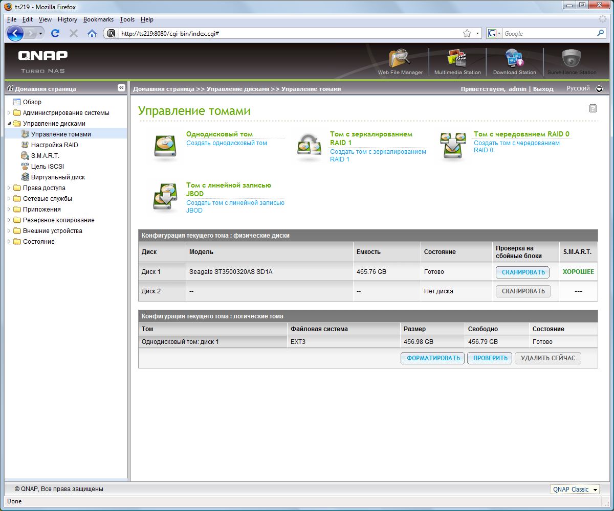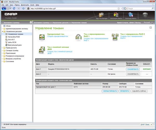 QNAP использует специальный раздел на дисках для хранения основной прошивки. Так что следующим этапом будет ее инсталляция. Эта процедура у последних моделей данного производителя реализована очень просто — в загрузочный модуль записан простой Web-сервер, который позволяет инициализировать диски и записать корневую файловую систему без использования каких-либо специальных программ (требуется только сетевой доступ и Web-браузер). Это выгодно отличает модели QNAP от продукции других компаний. С другой стороны, если у вас, как и у подавляющего большинства пользователей, установлена Microsoft Windows, то разница почти нивелируется. В тестах обоих накопителей мы использовали последнюю доступную версию прошивки — 3.1.1 build 0815.