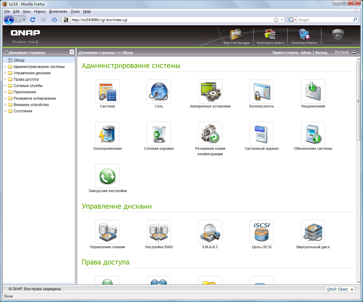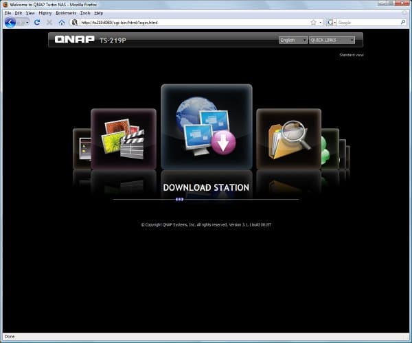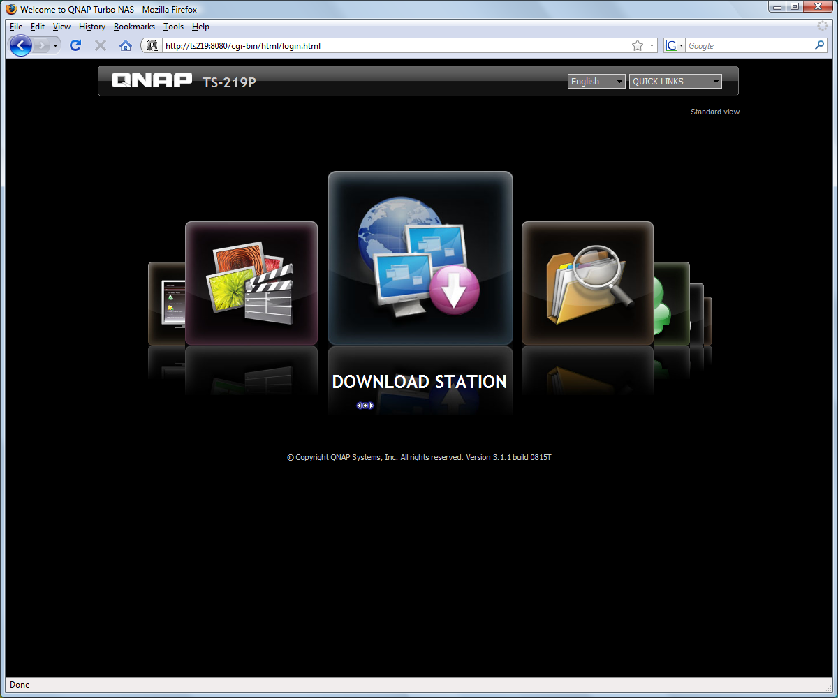 Стартовая страница предлагает выбор основных разделов в модном варианте CoverFlow-интерфейса с возможностью переключения на привычные иконки. Кроме входа в интерфейс администрирования здесь же представлены ссылки на активные дополнительные модули (например «Менеджер загрузки» или «Менеджер файлов»), форму технической поддержки и wiki-сайт QNAP.