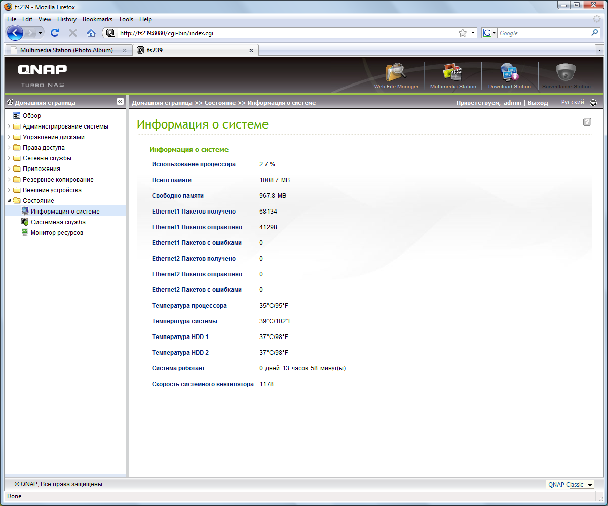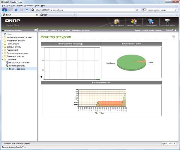 Ну и последняя группа страниц — «Состояние» — поможет быстро узнать различные текущие параметры системы. Например, загрузку процессора и оперативной памяти, температуру платы и дисков, время работы накопителя и состояние служб. А если браузер поддерживает технологию Flash, можно даже посмотреть на красивые графики по использованию процессора, сети и дискового пространства.