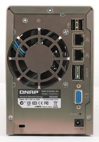 - TS-239 Pro: вентилятор (70 мм), два порта eSATA, два порта USB 2.0, два порта Gigabit Ethernet, порт VGA, кнопка сброса и разъем для подключения питания.
