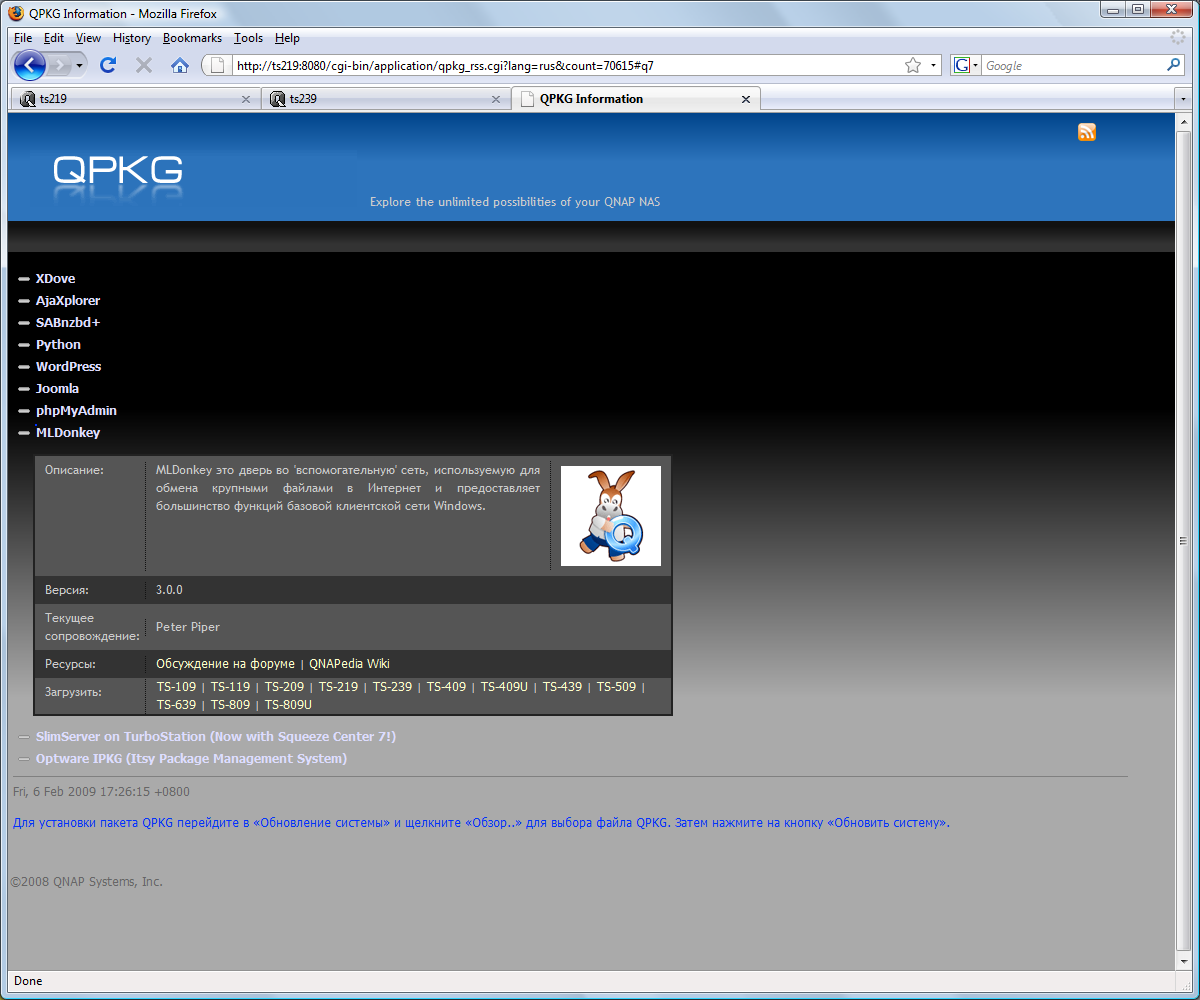 Если указанных функций не хватает, то на помощь приходит фирменная система установки дополнительных пакетов QPKG. Через нее можно установить более десятка различных модулей, включая eMule-клиент, среду разработки Python, движок для сайтов Joomla, движок для блогов WordPress, Web-менеджер для MySQL phpMyAdmin и почтовый сервер Xdove. Если и этого мало, то можно воспользоваться Optware, предоставляющей еще несколько тысяч сервисов. Кроме того, благодаря используемым в накопителях аппаратным платформам ARM/x86 и консольному доступу, существует возможность для самостоятельной компиляции и установки практически любых *nix-программ.