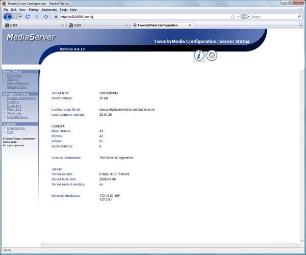 Для DLNA/UPnP-сервера использована одна из самых функциональных программ – TwonkyVision. Она индексирует файлы форматов jpg, gif, tif, bmp, png, mp3, m4a, aac, wma, ogg, mpeg, avi, divx, mp4, mkv, ts, m2ts, mov и wmv. По умолчанию фотографии сортируются по папкам и дате, музыка — по альбомам, артистам и жанрам, видео — только по папкам.