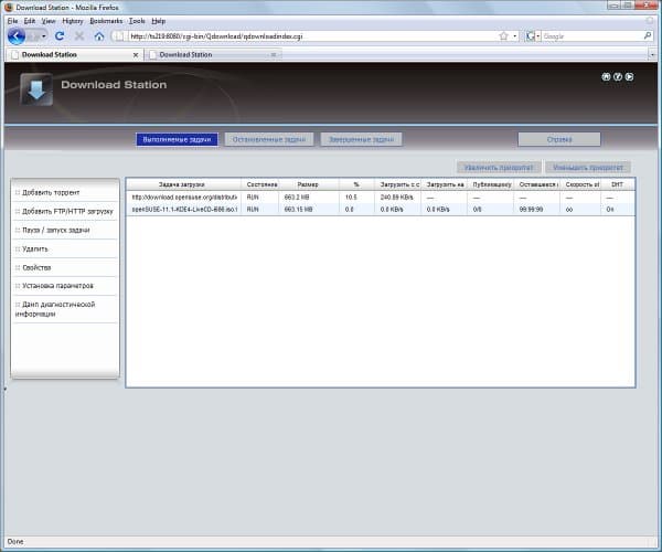 Для многих пользователей будет интересен модуль «Менеджер загрузки». В данном случае идет речь об автономной загрузке файлов по протоколам FTP, HTTP и BitTorrent. Для первых двух используется программа wget, а для торрентов — клиент на базе libtorrent. Большим разнообразием функционала модуль не отличается. Заданий может быть максимум десять. Раздача файлов после загрузки возможна в течение указанного времени. Среди параметров настроек — порты, максимальные скорости загрузки и отдачи, «проброс» портов через NAT по UPnP, время работы сервиса (один диапазон на все дни недели). В целом несколько грустно для устройств подобного класса и производительности. Так что для полноценного использования p2p рекомендуется установить альтернативную программу.