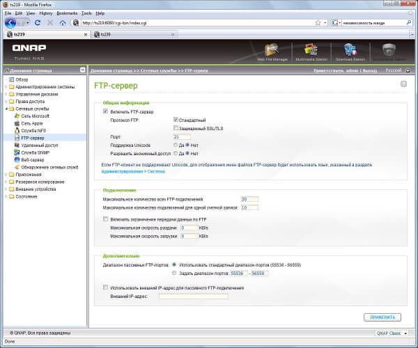 Следующая группа — «Сетевые службы» — посвящена настройке параметров стандартных протоколов сетевого доступа к файлам. Каждый из них (SMB/CIFS, FTP, NFS, AFP) может быть отключен независимо от остальных. Для сетей Windows допускается интеграция в домен, а FTP-сервер может похвастаться выбором портов (в том числе и для пассивного режима), поддержкой шифрования, кодировки Unicode, а также ограничениями по числу подключений и по скоростям. Здесь же находятся пункты управления доступом по telnet и ssh, сервисом SNMP, Web-сервером, а также службами UPnP и Bonjour, служащими для упрощения обнаружения сервера в сети.