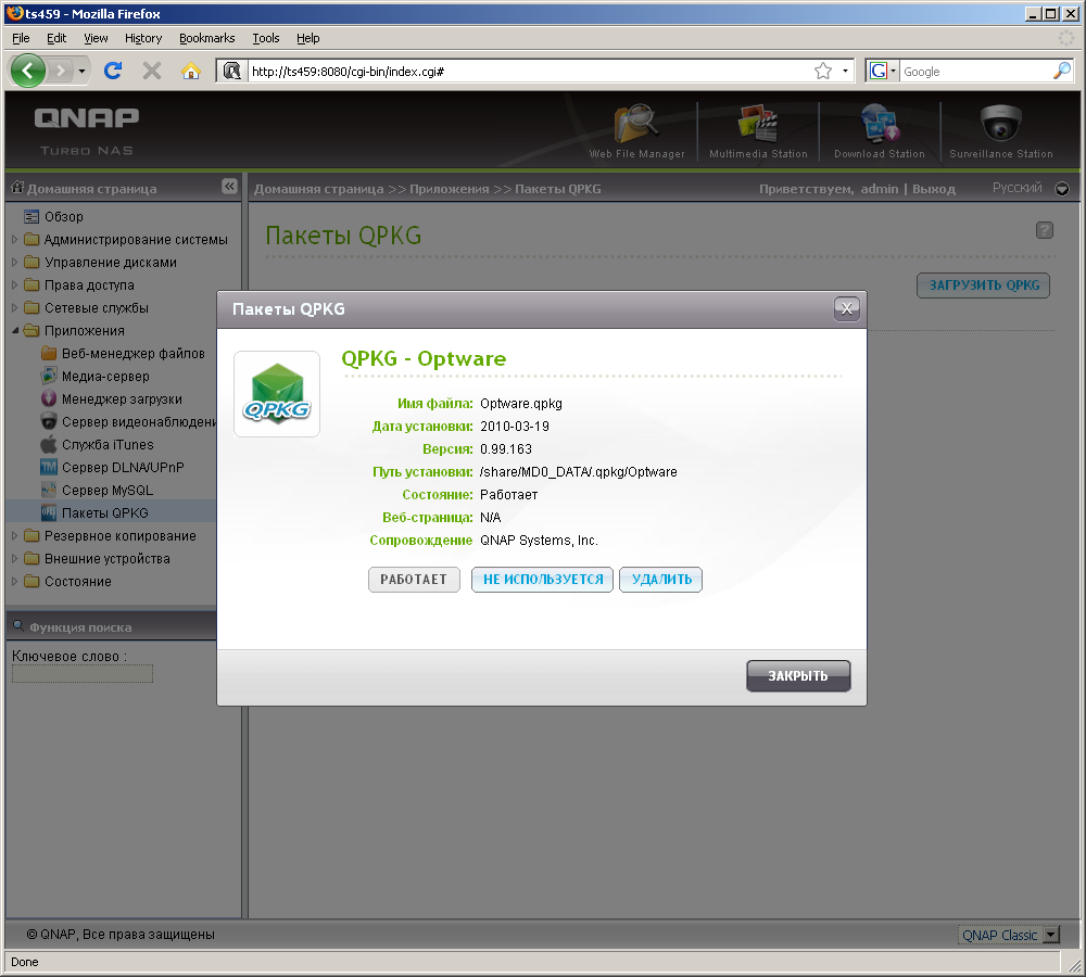Если же использовать консоль, то можно установить практически любые программы — тем более, что платформа TS-459 является x86-совместимой. В качестве компромисса можно установить через QPKG систему Optware, а потом через консоль добавлять в нее нужные пакеты.