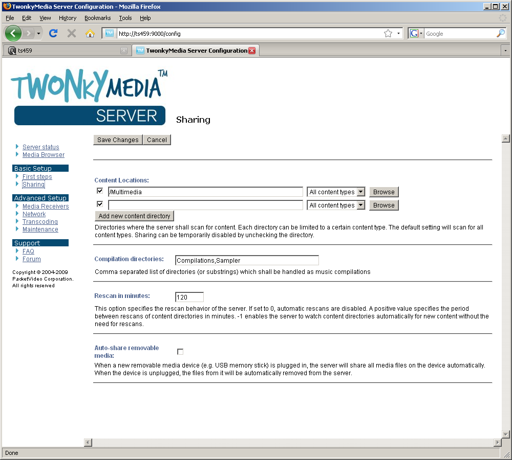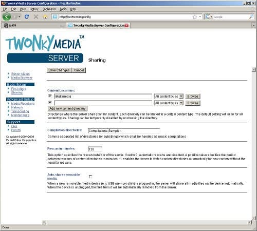 Для реализации UPnP/DLNA-сервера используется программа TwonkyMedia, продолжающая оставаться одним из наиболее функциональных и удобных решений. В использованной нами прошивке была интегрированная версия сервера 5.1.2. Кроме широкого спектра поддерживаемых медиаформатов и медиаплееров, программа интересна возможностью индексации любых директорий на накопителе, а не только заранее заданных. Кроме работы с файлами пользователя, сервер предлагает также несколько интернет-сервисов — Flickr, Picasa, SHOUTcast и YouTube.