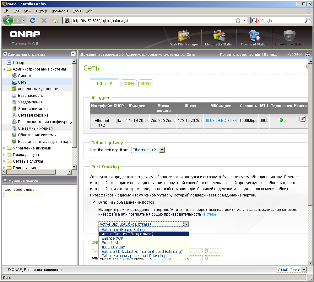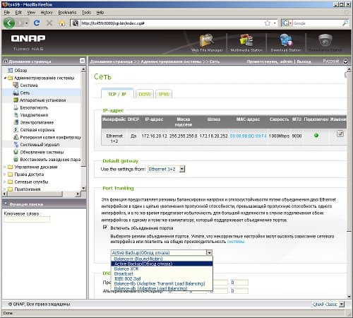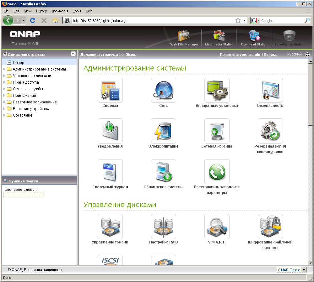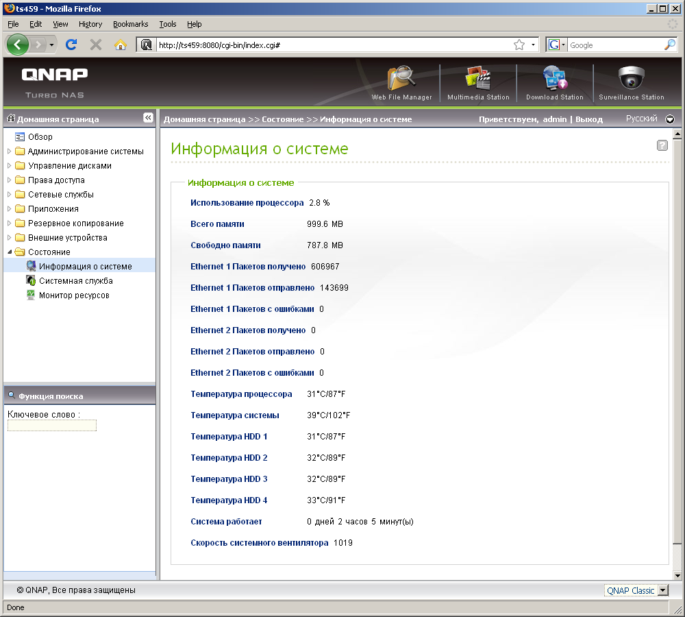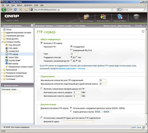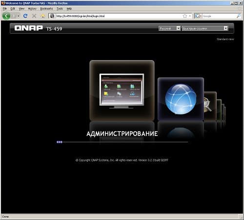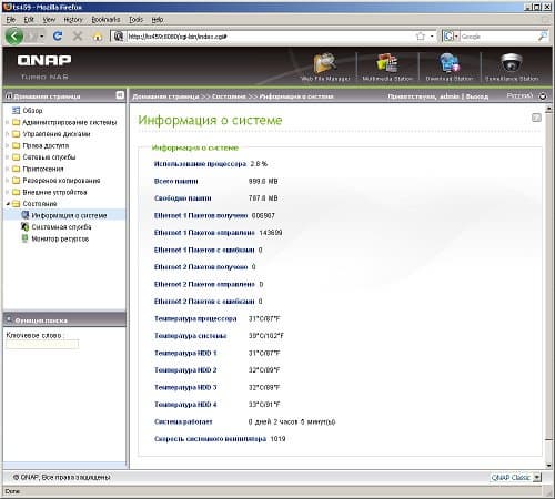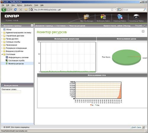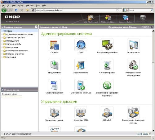 Web-интерфейс накопителей QNAP перетерпел значительные изменения и сейчас пользователь получает удобную современную оболочку, активно использующую технологии AJAX и Flash. Меню имеет достаточно качественный перевод, так что российские пользователи будут чувствовать себя уютно. Для безопасного управления через Интернет доступна опция SSL-подключения.