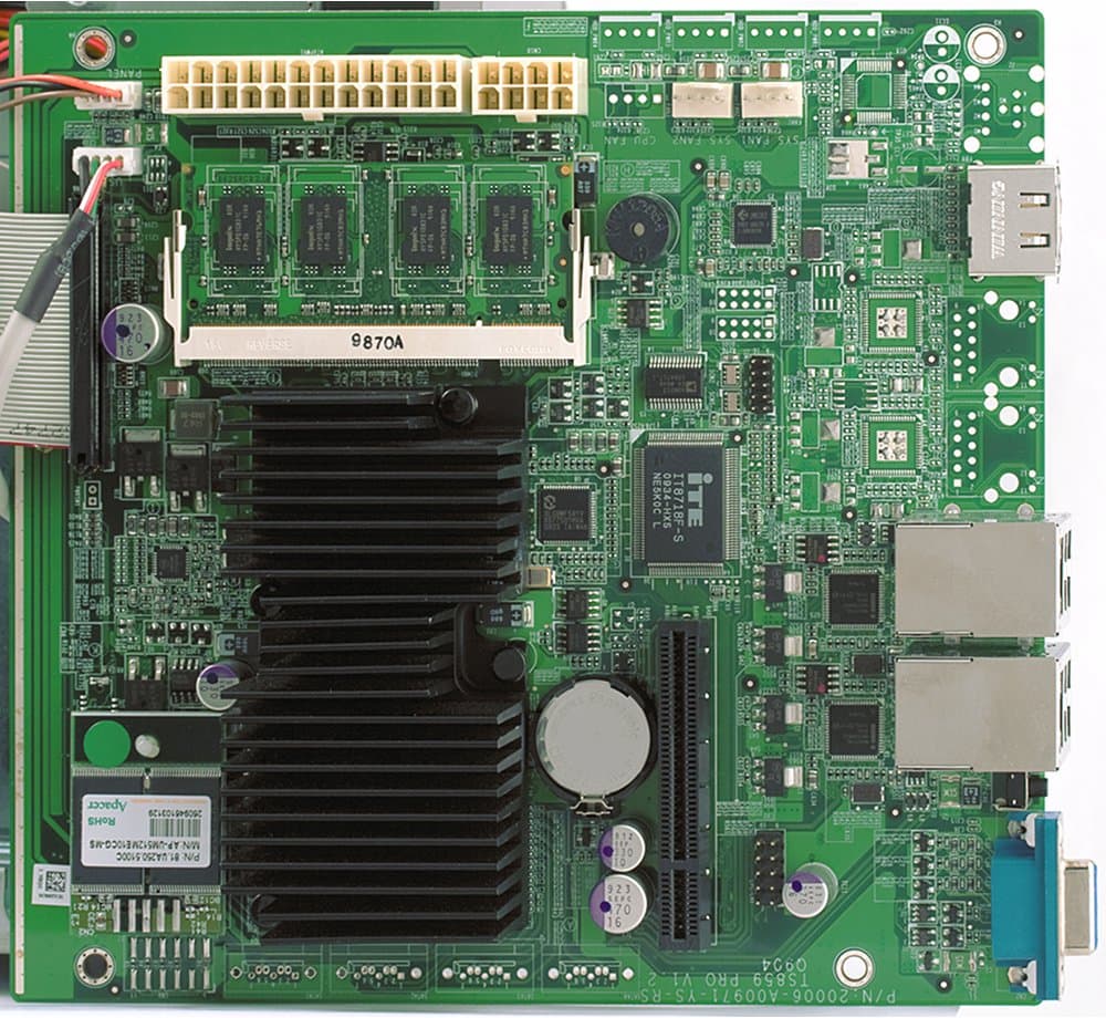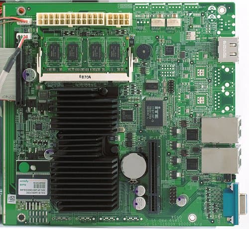 Накопитель имеет крепкую металлическую раму на которой установлены печатные платы — основная и три вспомогательных: для подключения винчестеров, блока индикации и порта USB. Аппаратная конфигурация несколько необычная — новый высокоинтегрированный чип Intel D510 (формально откликается на имя K510) в сочетании с южным мостом ICH9M. Они накрыты общим радиатором достаточно большого размера. Процессор здесь двухъядерный, поддерживает HT и работает на частоте 1,66 ГГц. Оперативная память устройства представлена одним модулем SO-DIMM стандарта DDR2-800 объемом 1 ГБ. При необходимости пользователь может его поменять на 2-ГБ модель. Учтите только, что эта операция явно нарушает гарантию. Как и у любого ПК, в этой модели есть BIOS, а основная загрузочная часть хранится на установленной на специализированном разъеме флеш-диске объемом 512 МБ. Интерфейс флэш-диска — обычный USB, поскольку все четыре чипсетных порта SATA заняты винчестерами, а PATA не предусмотрен. Для работы внешних портов eSATA установлен дополнительный чип Jmicron JMB362. Сетевые контроллеры предоставлены парой чипов Intel 82574L.