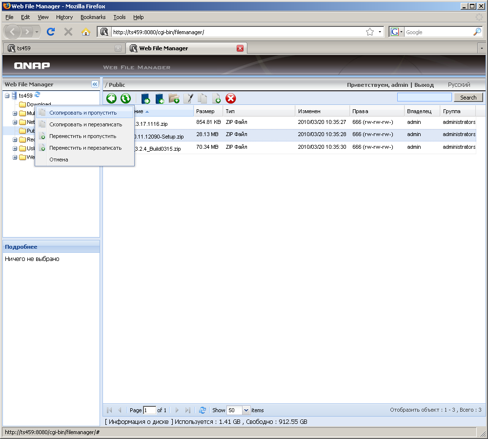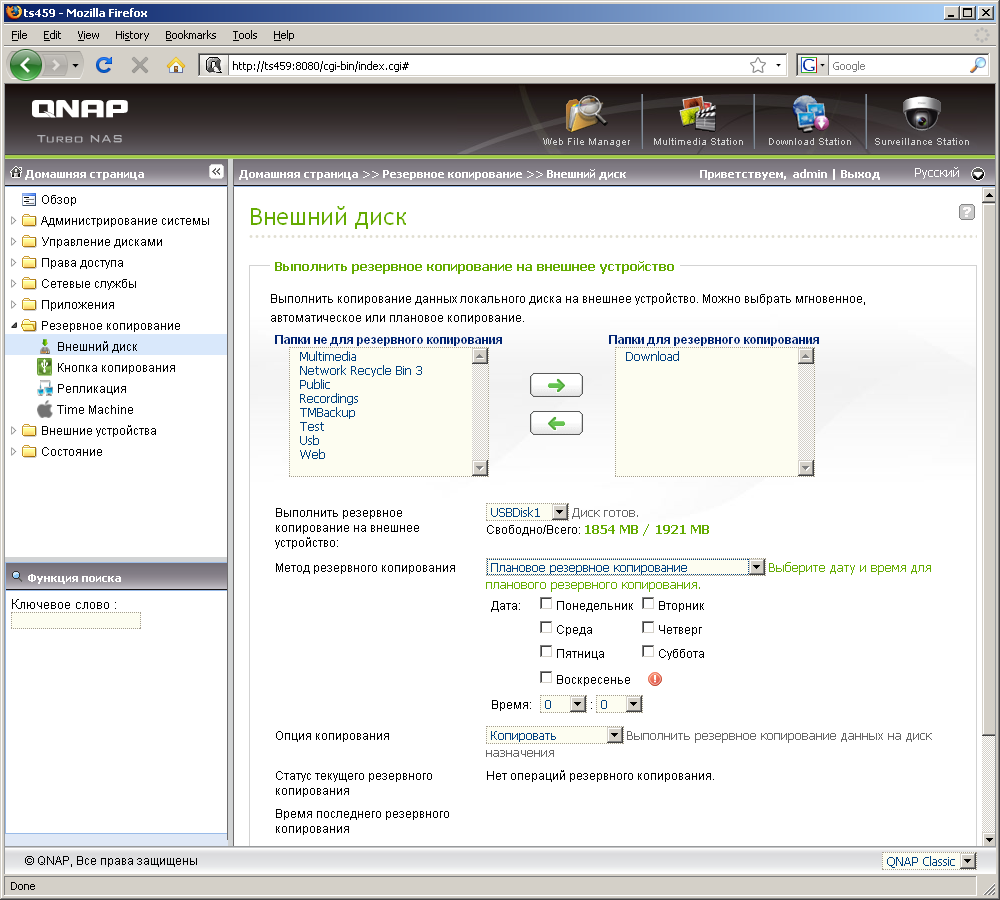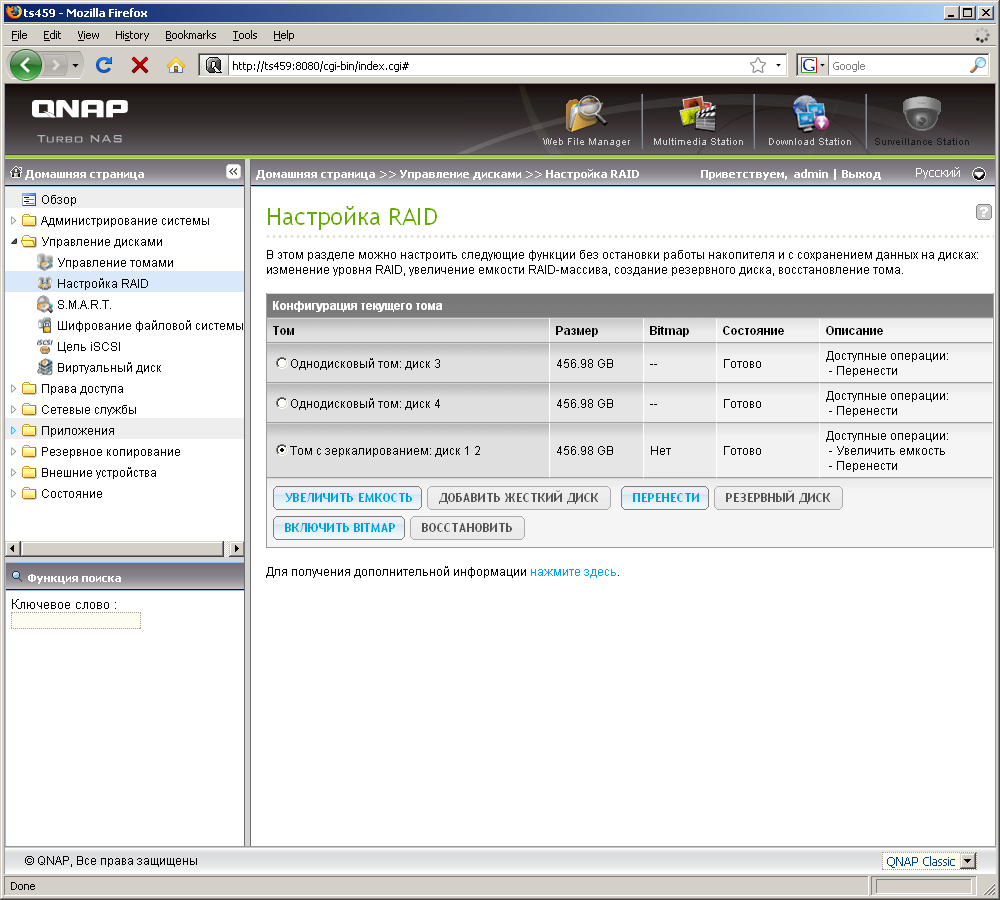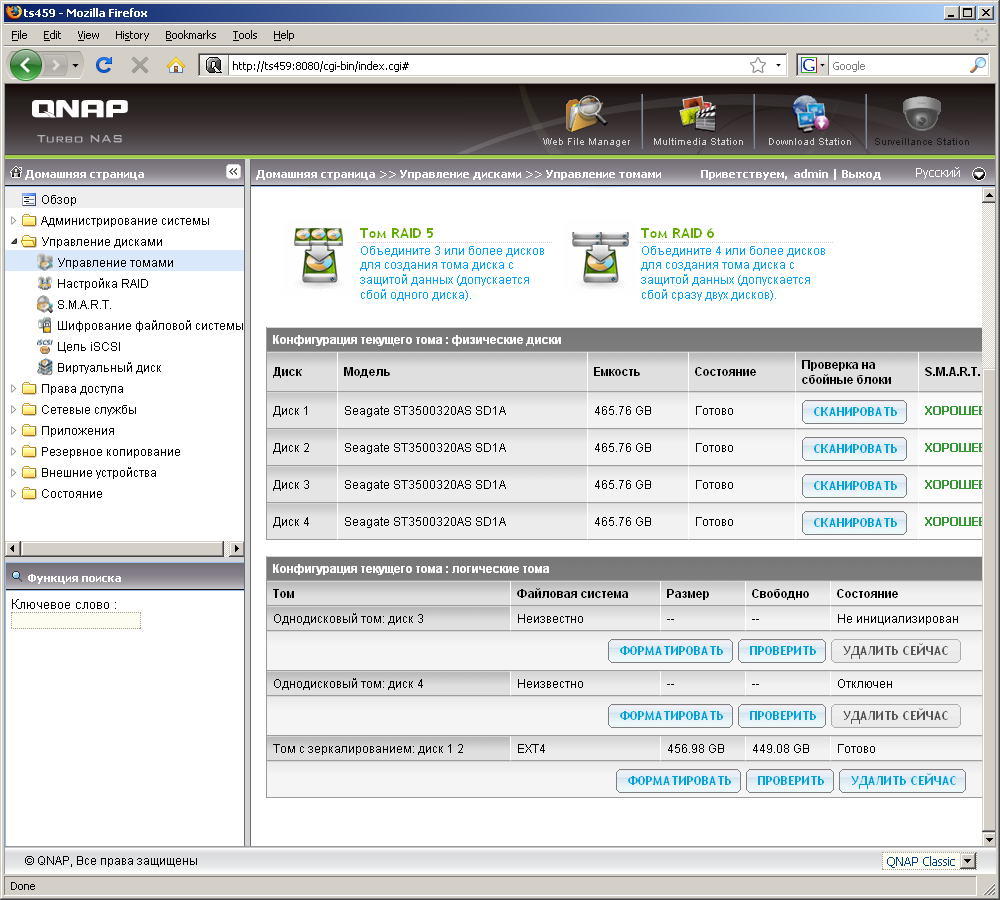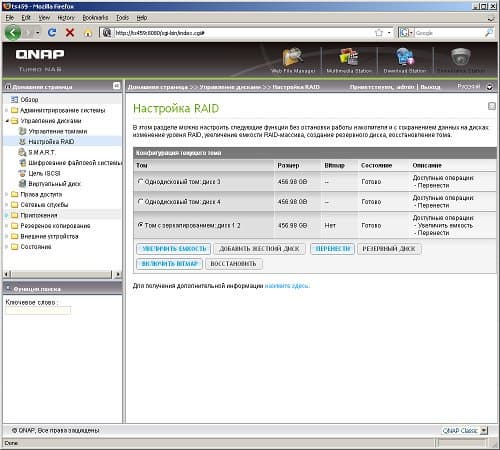 Как уже было отмечено ранее, серия TS-x59 оснащена флеш-памятью большого размера, что в сочетании с кнопками управления и матричным индикатором несколько упрощает инсталляцию накопителя — достаточно просто установить диски и выбрать необходимый режим RAID в меню. После этого будет осуществлено форматирование винчестеров и базовая настройка системы. Остальные операции осуществляются как обычно через web-интерфейс.