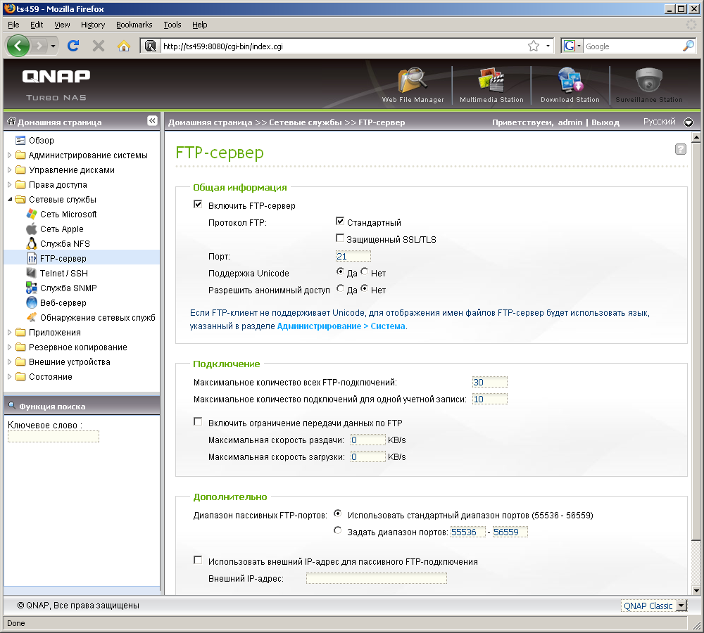 Общий список поддерживаемых протоколов доступа к файлам как раз включает упомянутые выше варианты. Для некоторых есть отдельные опции — настройка рабочей группы или домена для SMB/CIFS, выбор портов (включая пассивные) и ограничения скоростей/подключений для FTP и поддержка Unicode. Остальные протоколы могут похвастаться только возможностью включения/выключения. Для удобной интеграции в локальную сеть можно использовать два варианта автоматического обнаружения — UPnP и Bonjour.