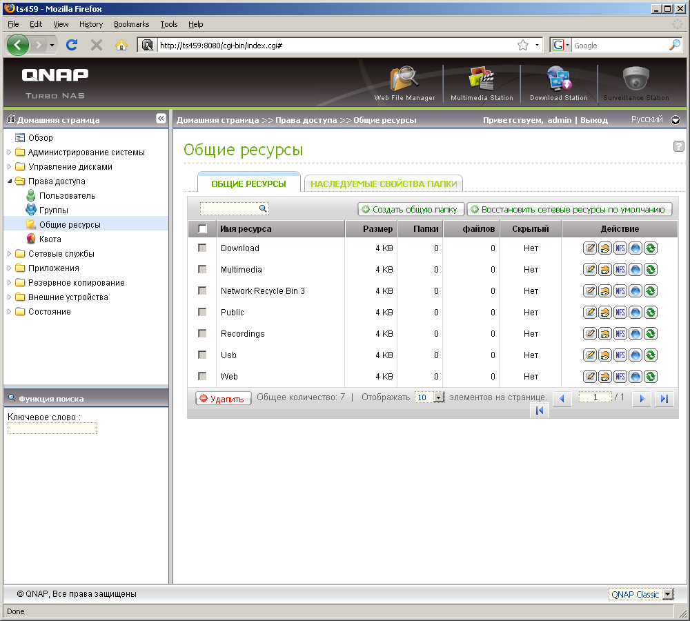 При создании первого дискового тома на нем автоматически создается несколько сетевых ресурсов, в частности папки Public, Download и Multimedia. К ним можно ограничить доступ, а вот удалить их уже не получится. Предусмотрена функция создания новых общих папок. При этом в опциях указывается на каком томе их разместить, скрывать ли из сетевого окружения и активировать ли OpLocks. Для управления правами используется привычный механизм «имя-пароль». Пользователи могут быть как локальные, так и из домена Windows. Аналогично все работает и с группами. Для упрощения процедуры создания большого числа пользователей, можно импортировать их список из текстового файла или создавать по шаблону с цифровым суффиксом. Система может также учитывать дисковые квоты, выдаваемые пользователям для каждого тома. Установка прав работает одновременно для протоколов SMB, AFP и FTP. Отдельно настраивается доступ через HTTP (WebDav) и NFS.