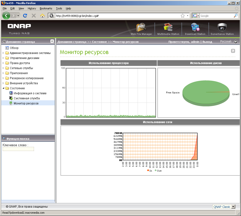 Если же говорить о функциональности, то и тут производитель продолжает подтверждать свое присутствие в группе лидеров — к услугам пользователя качественный медиасервер, система управления файлами через браузер, станция видеонаблюдения и готовые к установке дополнительные пакеты. Несколько грустно смотрится штатная станция загрузки файлов, однако относительно несложно заменить ее на более функциональный клиент.