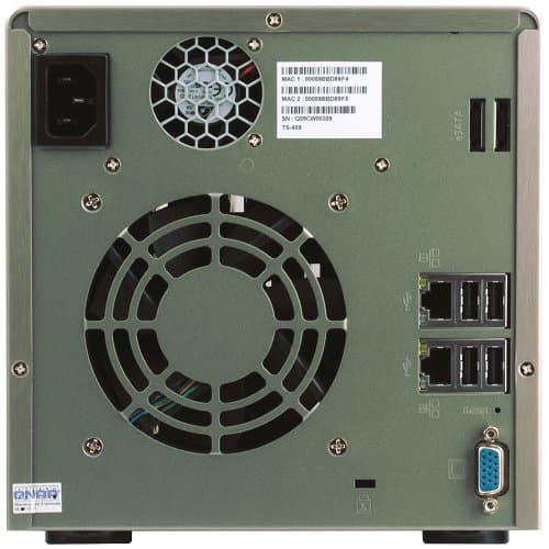 Посмотрим теперь на заднюю панель, на которой обычно расположено большинство разъемов. Не стал исключением и TS-459 Pro: в верхней части мы видим гнездо подключения кабеля и небольшой (40x20 мм) вентилятор встроенного блока питания, справа от него — два порта eSATA, а под ними — два сетевых порта и четыре USB 2.0. Есть даже разъем VGA для подключения монитора. Также нельзя не заметить основной вентилятор системы охлаждения.