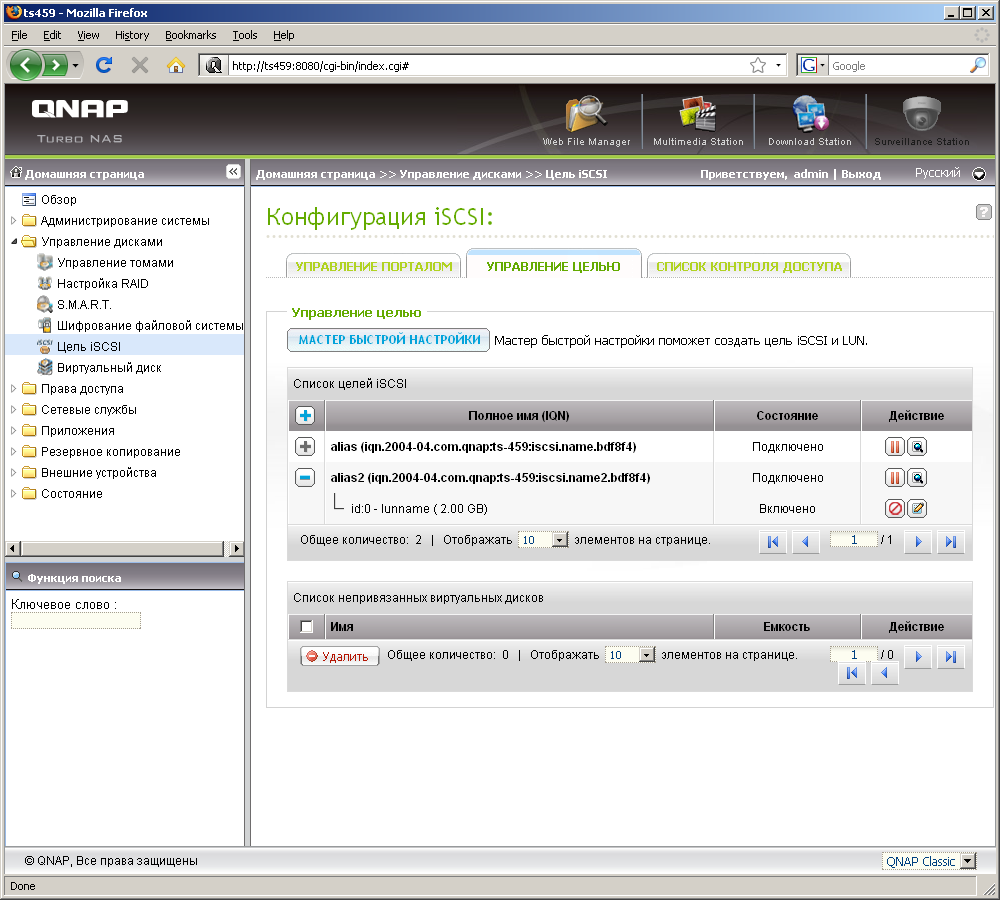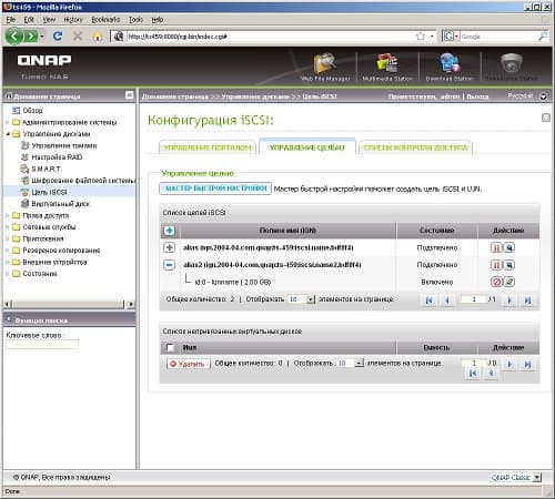 Интересно, что накопитель может и сам работать как iSCSI-клиент, подключаясь в том числе и к собственным томам. К сожалению, таким образом нельзя получить доступ к данным на уже размеченном и отформатированном другими средствами разделе. Но можно создавать новые общие папки.