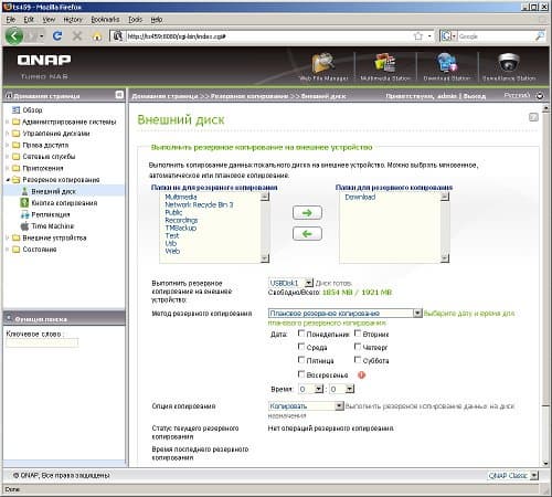 Группа «Приложения» позволяет настроить параметры функций, не относящихся непосредственно к хранению файлов. Мы опишем их чуть позже, а сейчас посмотрим на возможности по резервному копированию в самом устройства. Речь пойдет о копировании данных из общих папок на другие устройства, чтобы повысить надежность хранения. Рассматриваемая модель предлагает три варианта — копирование общих папок на внешние диски eSATA/USB, по сети на аналогичные накопители (репликация, используется или модификация протокола от QNAP или стандартный Rsync) и в интернет-хранилище Amazon S3. Еще одной функцией, относящейся к бекапам, является поддержка программы TimeMachine из Mac OS X. Для ее включения сделать придется пару кликов мышкой.