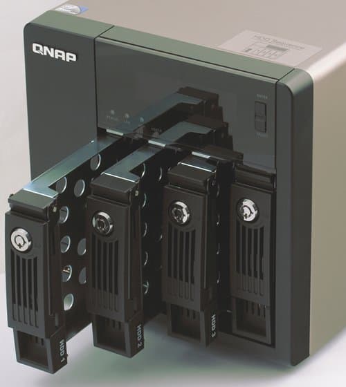 Как и многие современные устройства, TS-459 Pro допускает установку на рамки как 3,5'', так и 2,5'' винчестеров. Так что пользователю остается только смонтировать HDD на салазках, задвинуть их в накопитель и и включить его.