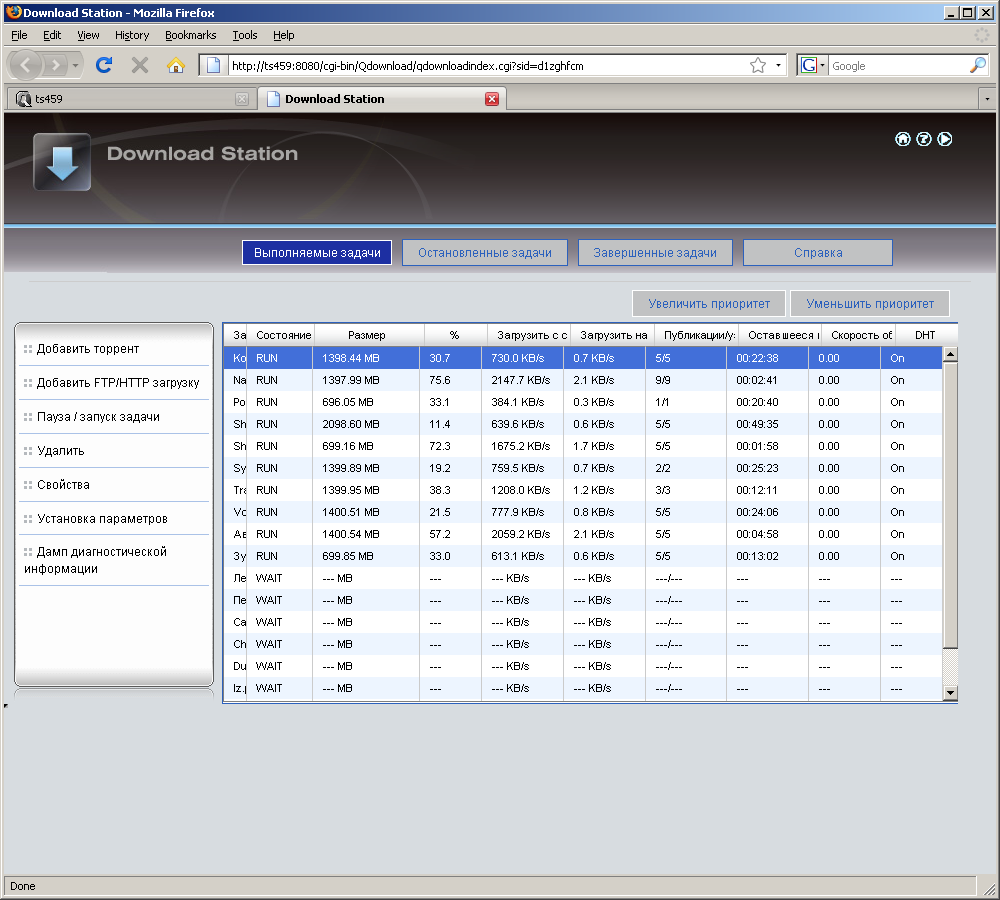 Одной из наиболее часто используемых функций сетевых накопителей является работа в качестве автономной станции загрузки файлов. TS-459 Pro поддерживает протоколы FTP, HTTP и BitTorrent. Управление задачами осуществляется через web-интерфейс или же специальную программу QGet. Из параметров для торрент-клинета есть выбор портов, максимального числа задач, ограничение скоростей и автоматическое перенаправление порта на роутере через UPnP. Сервис может работать постоянно или в указанные временные интервалы, общие для всех дней недели. После окончания загрузки файлы могут раздаваться в течение указанного пользователем времени. Также есть управление приоритетами и поддержка DHT. В качестве клиента работает программа rTorrent с дополнительными утилитами управления. Очень странно выглядит ограничение в десять активных задач для данного высокопроизводительного устройства. Мы попробовали найти предел по скорости загрузки, но он оказался совпадающим с возможностями доступного интернет-канала (до 9 МБ/с на десятке задач). В этом режиме мониторинг показывал практически 100% загрузки процессора устройства, однако в реальности не все так плохо — скорость чтения и записи файлов по сети, измеренная в этот момент, составляла 30-40 МБ/с.