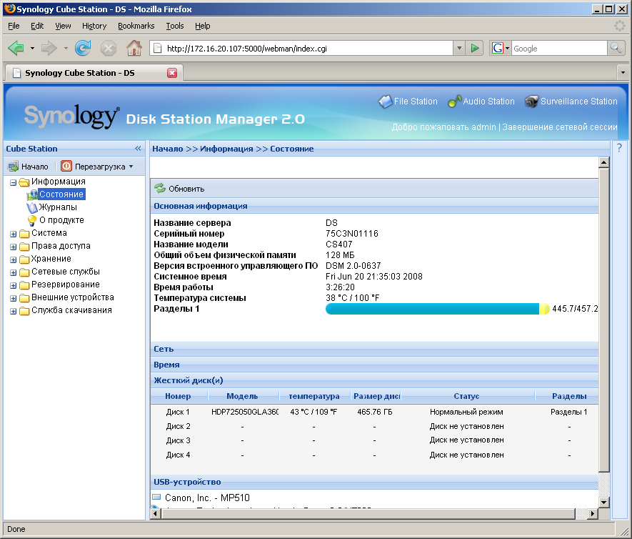 Все пункты настроек организованы в древовидную структуру. В первой папке находятся статусная страница, логфайлы и данные о торговых марках. Страница статуса позволяет быстро проверить состояние устройства — версии прошивки, имена, IP-адреса, общий и занятый объем дисков, температуру дисков и платы, состояние подключенных USB-устройств. Списков событий есть несколько — системный, подключений, операций резервного копирования. Отметим, что при желании можно экспортировать логи в файлы html.