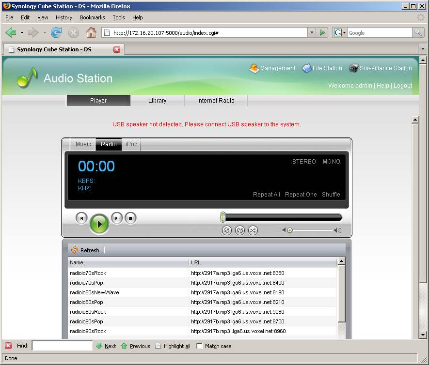 Если подключить к накопителю USB-колонки (список совместимых приведен на сайте), то Audio-станция позволит проигрывать через них музыку и Интернет-радио. Мелодии можно организовывать в списки воспроизведения и слушать в разных режимах (случайный порядок, повтор и т. п.).