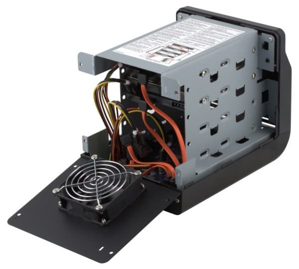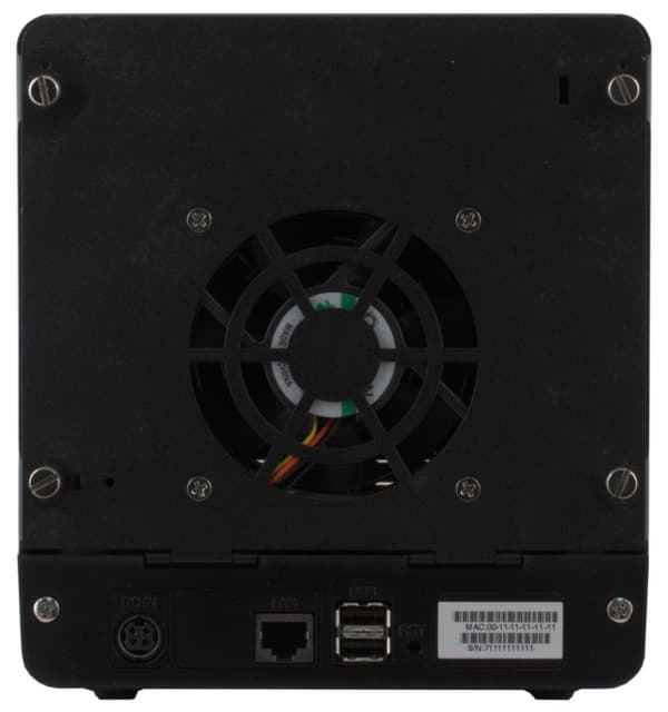 Для охлаждения используется один 80 мм вентилятор, установленный в центре задней панели. Забор воздуха происходит через две решетки на лицевой стороне устройства. Замена штатного вентилятора на более тихую модель позволит несколько снизить уровень шума, но это актуально только если не жесткие диски вносят основной вклад. Скорость вращения вентилятора зависит от температуры устройства, однако до высоких оборотов нам не удалось его довести. Максимум температуры, который мы получили во время тестов, составил 45 градусов (и для дисков, и для платы) при установке двух быстрых терабайтных дисков.