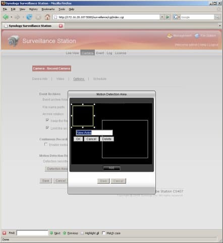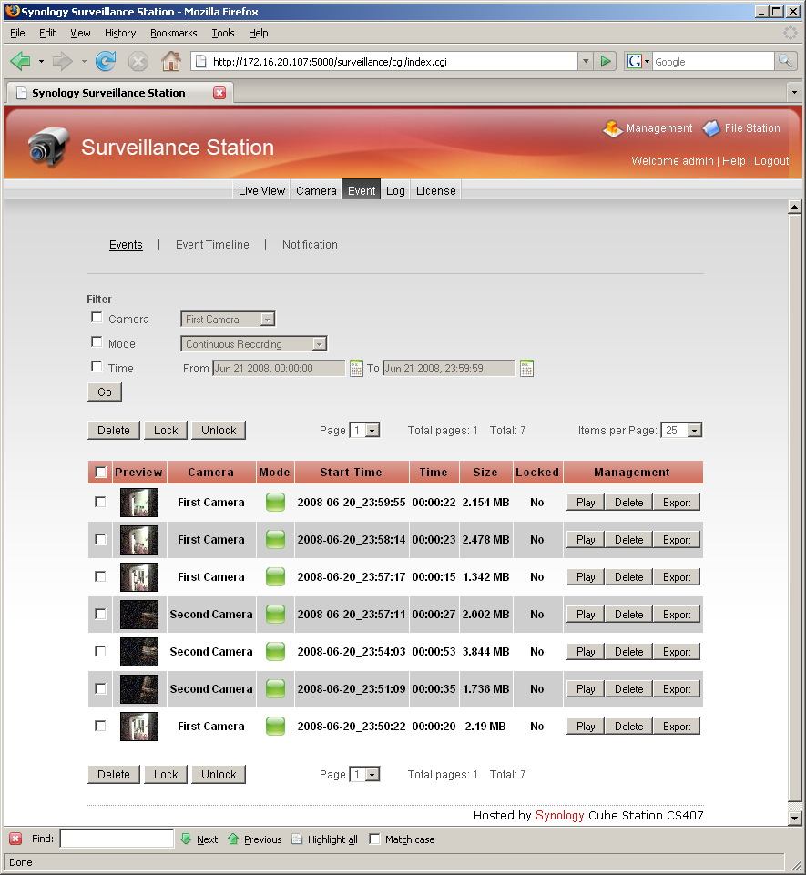 Результаты работы сохраняются в указанные директории общей папки «surveillance». Имя файлов получается из комбинации префикса, даты и времени события. Доступ к папке по сети имеет только администратор и поменять это штатными средствами нельзя. Сами файлы представляют собой обычные AVI с кодеком MJPEG и частотой кадров 3. Битрейт для разрешения 640×480 составляет около 1 Мбит/с. Для просмотра списка записей из Web-интерфейса предусмотрена отдельная страница. На ней отображаются записи с указанием имени камеры, даты и времени, типа записи, длительности, размера файла и небольшим превью. Записи можно фильтровать по камера, типу и дате. При необходимости можно установить блокировку на удаление (как в цифровых фотоаппаратах). Есть отдельные кнопки для удаления, экспорта или просмотра в большом окне записей. События кроме варианта списка могут быть представлены и на Timeline. В этом режиме можно выбрать камеру, дату и масштаб шкалы (день или час).