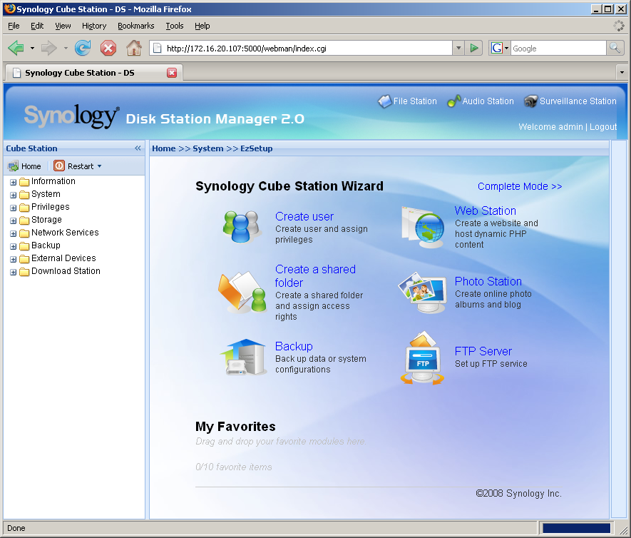 Официальный номер использованной прошивки — 2.0-0637. Отметим, что данную версию можно установить практически на все современные модели, включая DS-107+ и DS-207+. Наиболее заметным внешне отличием новой серии прошивок является полностью переработанный интерфейс. Теперь он основан на AJAX, что более красиво и существенно функциональнее. Настраивать накопитель стало гораздо проще. Как и ранее, при первом заходе на накопитель можно выбрать, какую функцию вы будете использовать — настройку, файловый менеджер, систему видеонаблюдения и так далее. При желании и после входа можно легко переключаться между ними.