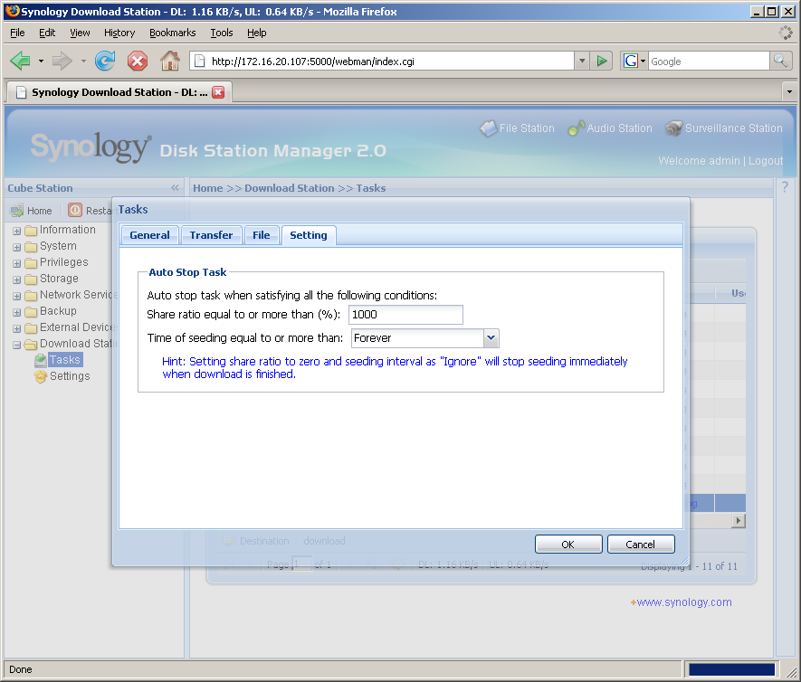 Одна из наиболее популярных функций — автономная загрузка файлов по FTP, HTTP и BitTorrent в последней версии прошивки была существенно улучшена. Теперь управление торрентами стало более удобно. В частности файлы могут раздаваться бесконечно долго, что должно понравиться пользователям рейтинговых систем. Настройки сервиса включают в себя — выбор директории для хранения файлов, ограничение количества одновременных загрузок (1,5,.. 20), ограничение времени работы сервиса, тип сортировки заданий, выбор портов, ограничение общей скорости загрузки и отдачи, ограничение количества пиров на торрент, включение DHT, установка порога раздачи (в % от объема и по времени). Удобно, что позже последние два параметра можно менять отдельно для каждого торрента. Так что в целом можно отметить существенный прогресс в данном решении. Хотя, что улучшать всегда найдется.