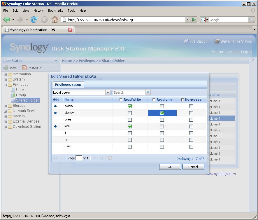 Следом идет настройка пользователей, групп и общих папок. Функции стандартны — создать, удалить, изменить. Однако благодаря AJAX использовать их очень удобно. Права на папки устанавливаются для пользователей и/или групп как «запись», «только чтение», «нет доступа».