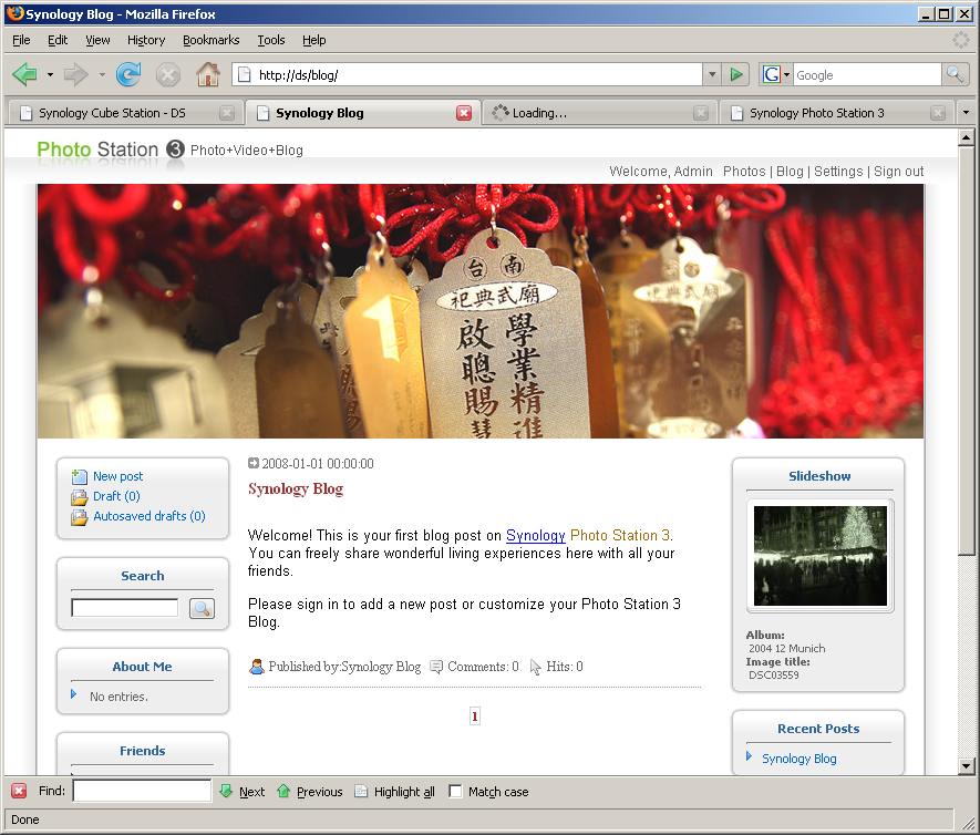 Photo-станция в своей третьей версии кроме фотоальбомов позволяет использовать видео и блоги. Так что процесс публикования и обсуждения своих творений легко вынести и в Интернет. Потребуется только пробросить один порт на роутере. Кстати при желании можно с использованием Google найти уже опубликованные на NAS от Synology сайты. Сейчас их уже тысячи. Для работы в системе необходимо завести отдельных пользователей (список не совпадает с указанным для сетевого доступа). Сделать это может администратор или созданным им пользователь с такими правами. Альбомы представляют собой папки в общей директории photo. Администратор может ограничить доступ пользователей к ним или сделать публичными (тогда их может посмотреть любой посетитель, даже без регистрации). Альбомам можно давать название и описание, разрешать комментировать их. Блог достаточно функциональный — допускает изменение структуры страницы, добавление и настройку модулей, работу с архивами и многое другое. Подробный рассказ о нем может растянуться на целую статью.